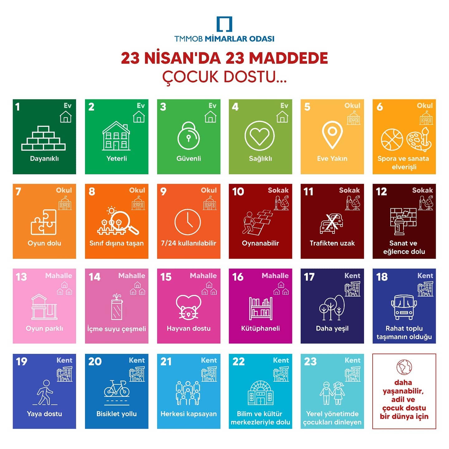 Meclisin kurulmasından tam dokuz yıl sonra, Mustafa Kemal Atatürk bu bayramı çocuklara armağan etmiş ve 23 Nisan ilk defa 1929 yılında Çocuk Bayramı olarak da kutlanmaya başlanmıştır. Çocukların nitelikli, sağlıklı ve donanımlı kentsel çevrelerde yaşaması, her kesim kadar Mimarlar Odası’nı da yakından ilgilendirmekte, bu sorumluluğun ülkemizin ve kentlerimizin yönetiminde görev alan karar vericiler tarafından yerine getirilmesi gerekliliğini hatırlatmayı görev biliriz. Bu amaçla Çocuk ve Mimarlık Çalışma Grubumuzun çalışması doğrultusunda “23 Nisan'da 23 maddede çocuk dostu ev, okul, sokak, mahalle ve kent” için beklentilerimizin neler olduğunu derledik. “Daha yaşanabilir, adil ve çocuk dostu bir dünya” için harekete geçmek adına bu maddelerin önemli bir başlangıç noktası oluşturacağını umuyor, bu doğrultuda çalışma yürütmek için yetkililere sesleniyor ve yapılacak çalışmalara katkıda bulunmaya hazır olduğumuzu ifade ediyoruz.