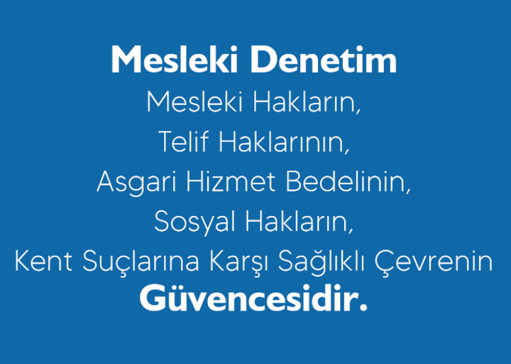 Mesleki denetim uygulaması, tamamen oda-üye ilişkisi ve bunu düzenleyen yasa ve yönetmelikler gereği üyelerin mesleki çalışmalarını inceleme ve denetleme yetkisinin kullanılmasıdır. Bir onay ya da vize işlemi değildir. Bunun da ötesinde, herhangi bir estetik veya içerik denetimi de içermez. Tamamen üyelerimizin mesleki faaliyetlerinin kayıt altına alınarak sicillerinin tutulması esasına dayanır. Bu çerçevede tutulan mesleki denetim kayıtları, üyelerimizin kamu kurumları nezdindeki iş ve işlemlerinde en güvenilir ve kapsamlı kaynaktır. Sistematik biçimde kayıt tutan ve kayıtlara dair ilgili idarelere bilgi ve belge sağlayan tek kurum Mimarlar Odası’dır.